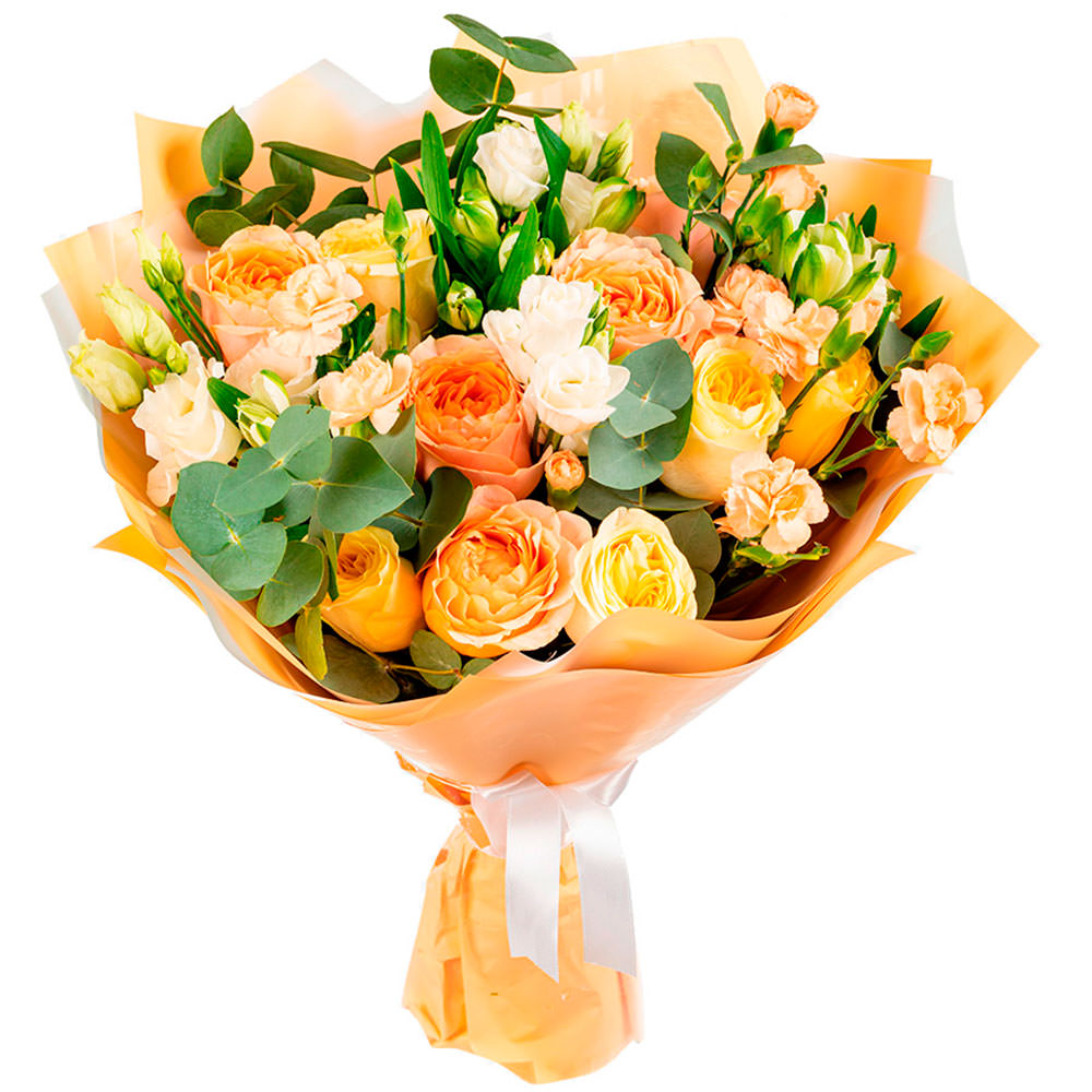 Роза одноголовая пионовидная, эустома, эвкалип.